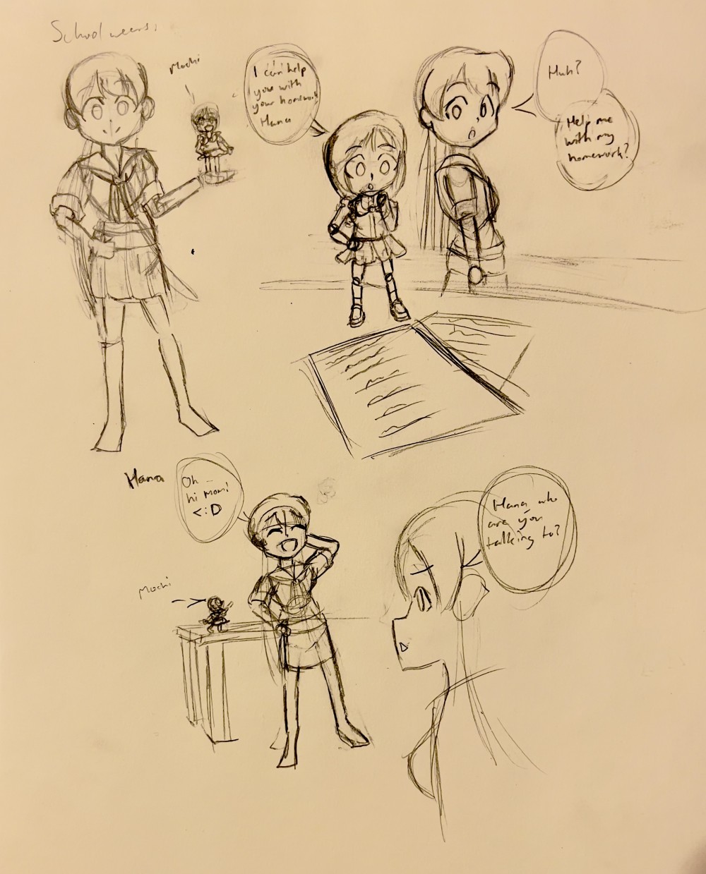 Rough storyboard for a character called Mochi. Sketched out on paper.
